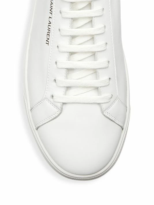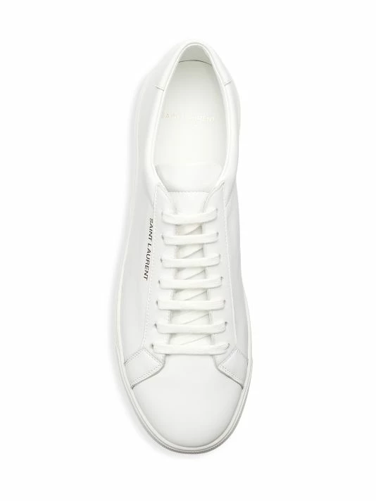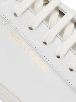 Saint Laurent introduced its famous Le Smoking tuxedo in 1966, a rendition of the classic men’s smoking suit made for women. Inspired by the iconic silhouette and 1970s women’s archival pieces, Creative Director Anthony Vaccarello reinterprets these styles for menswear with slinky, billowing shapes, delicate textures, and intricate patterns. The result is a unique, androgynous look that celebrates fluidity as a cornerstone of contemporary fashion. These sleek leather sneakers feature elegant, understated logos on the side and heel.