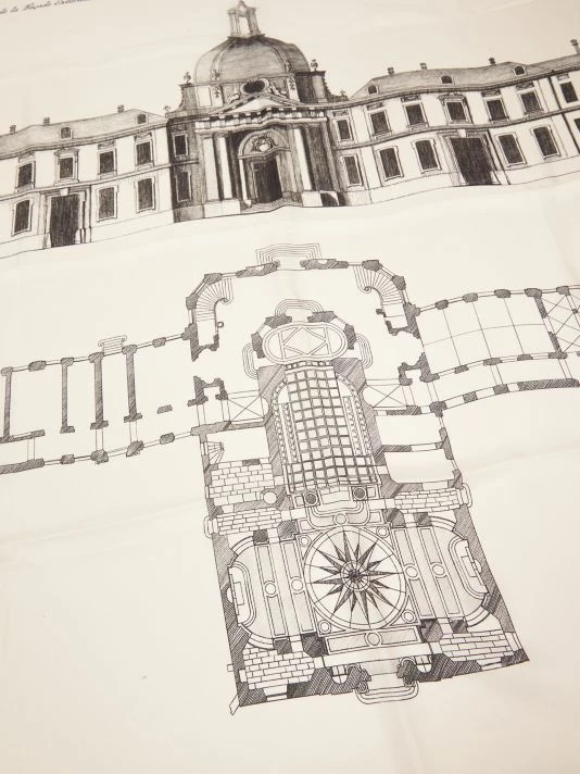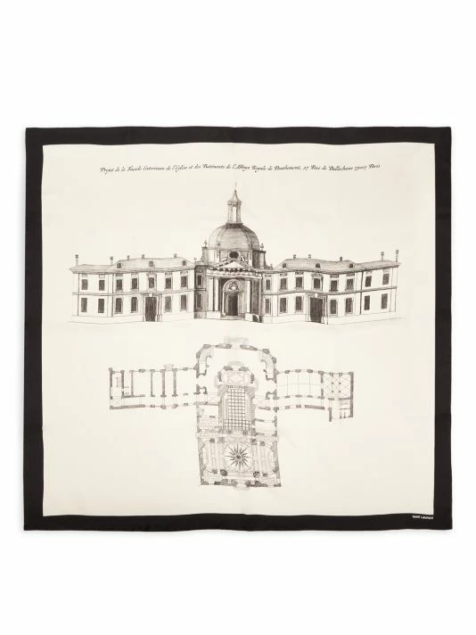 Framed with a solid border, Saint Laurent’s Archi Bellecha scarf showcases a vintage graphic of a Paris building. This square piece is crafted of fine silk in Italy.