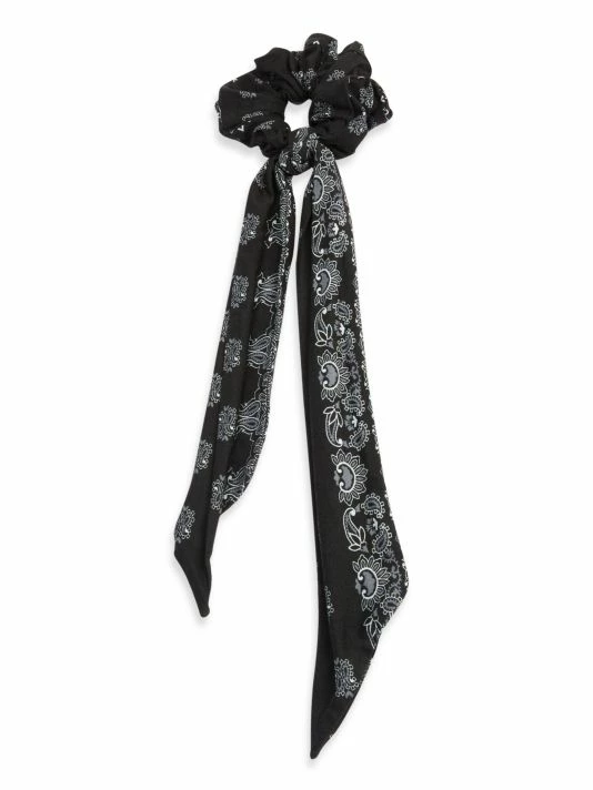This scrunchie feature a bandana print with a knotted detail.