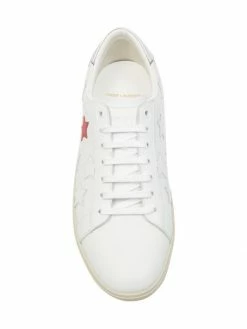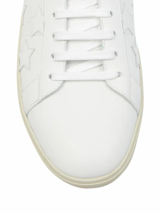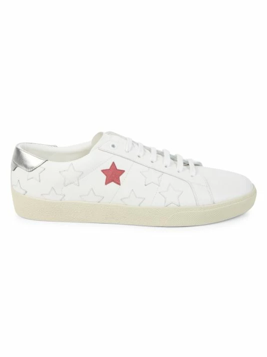 Leather low-top sneakers with star appliques and a metallic heel accent.