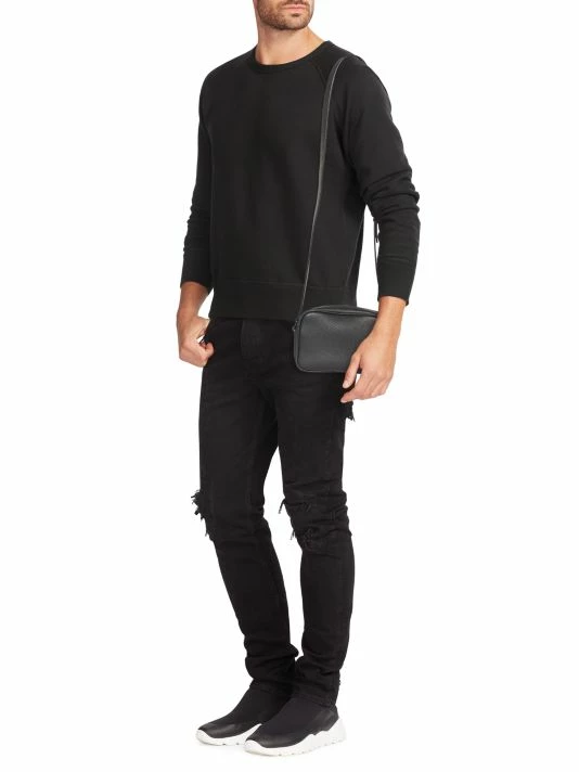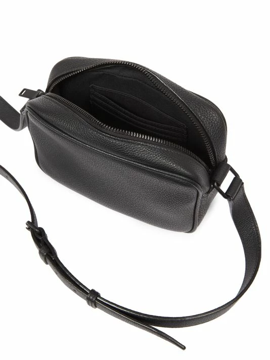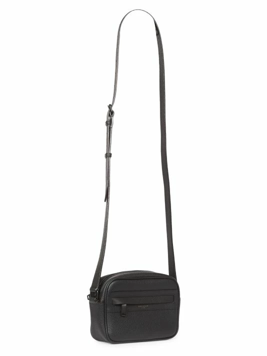 Saint Laurent introduced its famous Le Smoking tuxedo in 1966, a rendition of the classic men’s smoking suit made for women. Inspired by the iconic silhouette and 1970s women’s archival pieces, Creative Director Anthony Vaccarello reinterprets these styles for menswear with slinky, billowing shapes, delicate textures, and intricate patterns. The result is a unique, androgynous look that celebrates fluidity as a cornerstone of contemporary fashion. Crafted of leather, this camera bag has a minimalist aesthetic, flaunting a subtle metallic foil logo at the front.