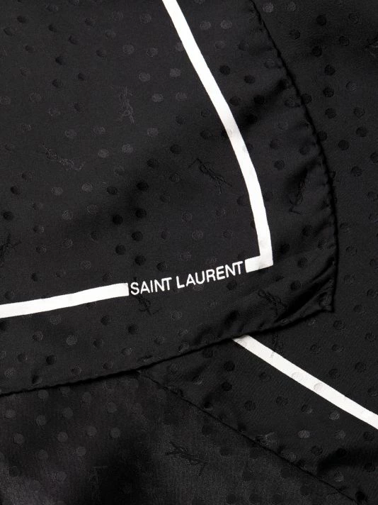 Square scarf decorated in allover YSL logo monogram and dotted jacquard, framed with a solid stripe and signature logo lettering.