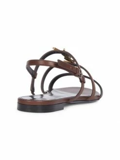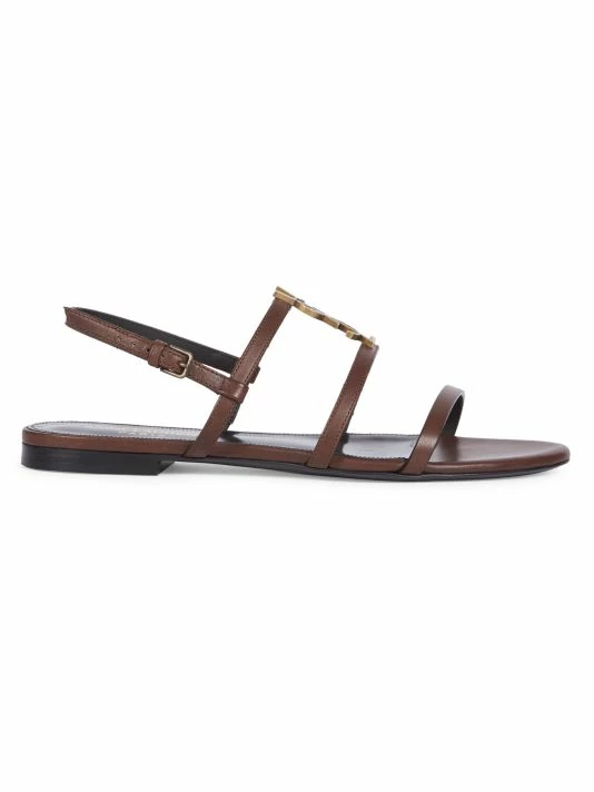 Strappy flat sandals flaunt petite goldtone monogram hardware in a smooth leather finish.