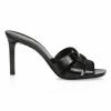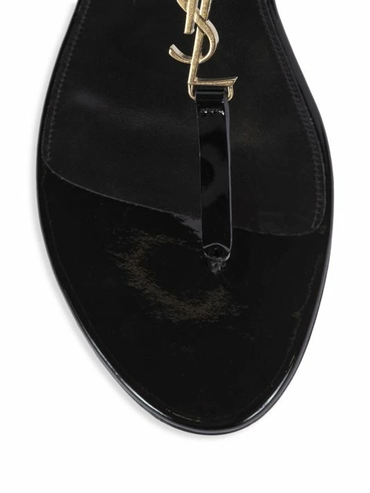 Strappy flat thongs flaunt petite goldtone monogram hardware in a patent leather finish.
