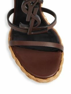 A woven raffia-covered wedge heel anchors these statement strappy sandals with a bold logo plaque across the instep.