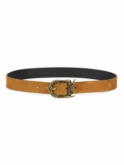 Vintage suede belt elevated with a goldtone buckle decorated with celtic motifs and YSL initials.