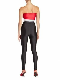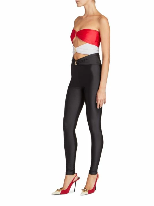 With a bold colorblocked design, this jumpsuit gathers at a stacked bodice adorned with goldtone monogram hardware.