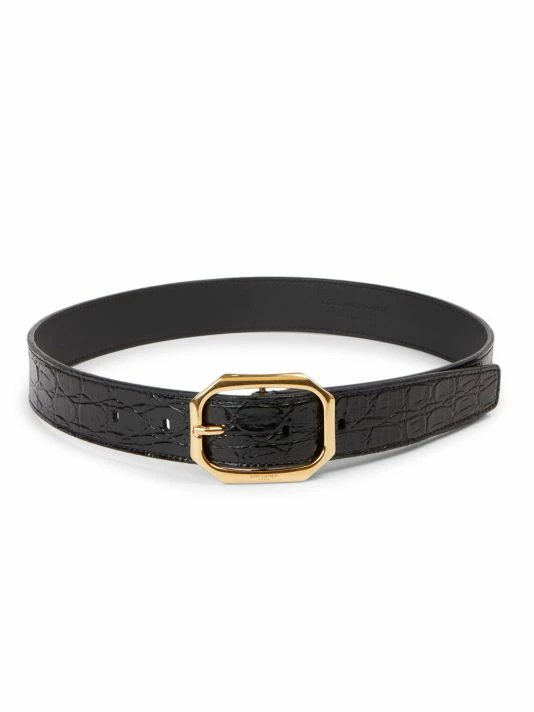 Styled with an octagonal goldtone-metal buckle, Yves Saint Laurent’s belt is crafted of croc-embossed leather.