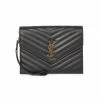 Crafted of croc-embossed leather, Saint Laurent’s clutch includes a goldtone chain-link shoulder strap.