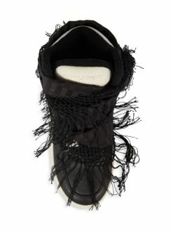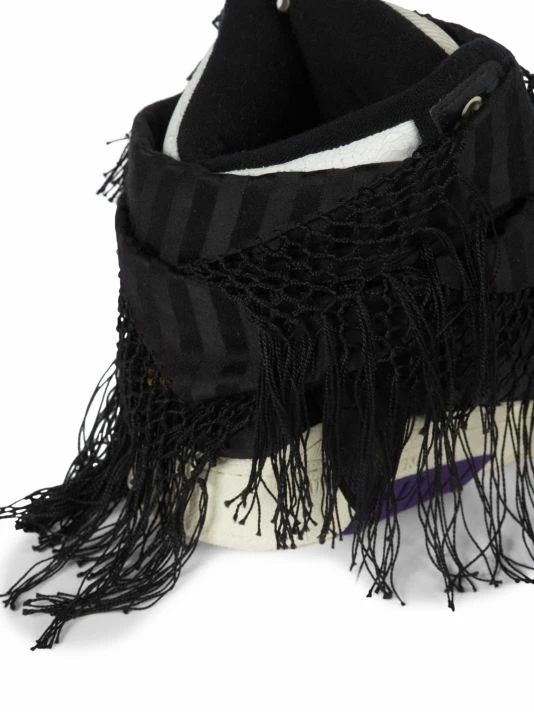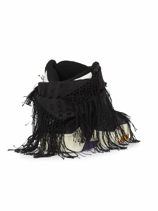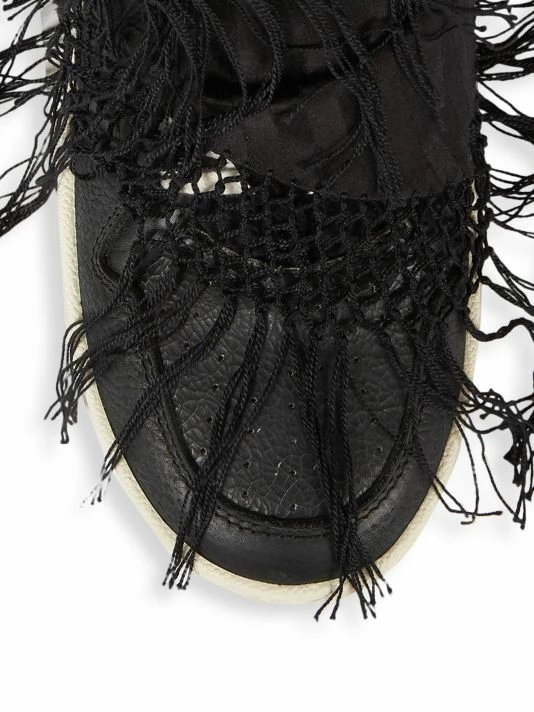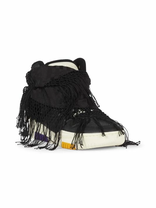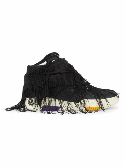Saint Laurent introduced its famous Le Smoking tuxedo in 1966, a rendition of the classic men’s smoking suit made for women. Inspired by the iconic silhouette and 1970s women’s archival pieces, Creative Director Anthony Vaccarello reinterprets these styles for menswear with slinky, billowing shapes, delicate textures, and intricate patterns. The result is a unique, androgynous look that celebrates fluidity as a cornerstone of contemporary fashion. These mid-top sneakers feature a distinctive fringed net appliqué. Colorblock detailing at the midsole completes the look.
