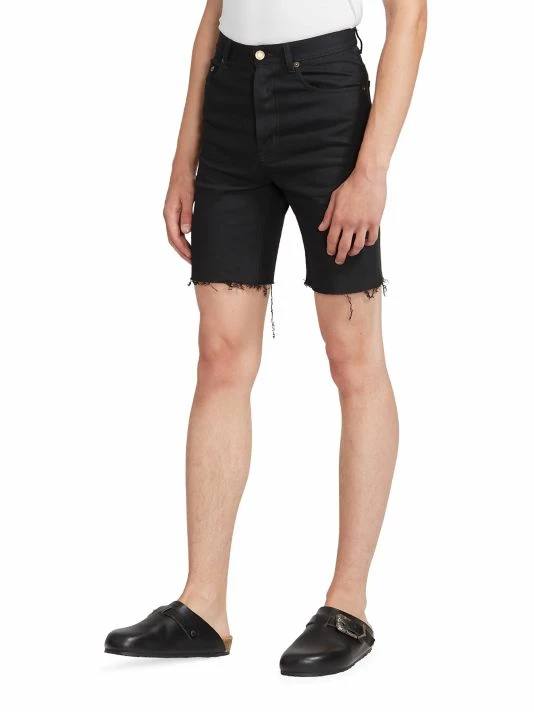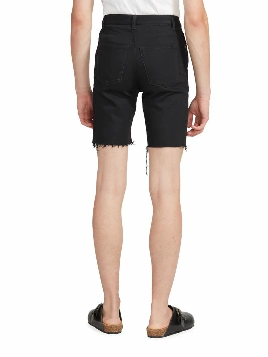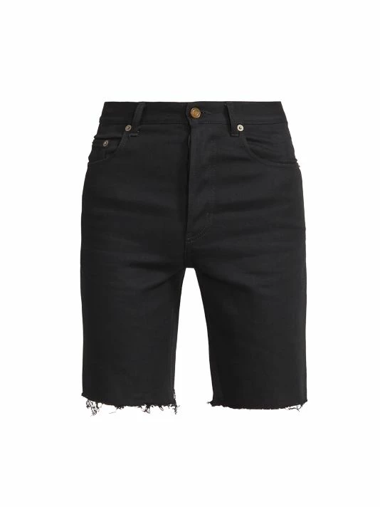 A pair of classic black denim shorts featuring a raw hem for a relaxed look.