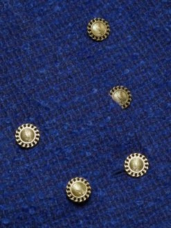 Double-breasted tweed blazer with a plunging V-neck and luxe brand-embossed goldtone button closures.