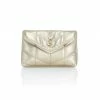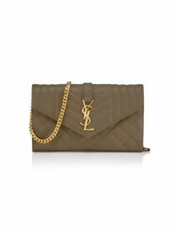 Luxe quilted pebbled leather wallet with a convertible shoulder chain and YSL logo medallion.