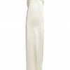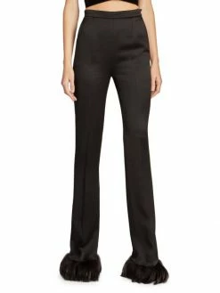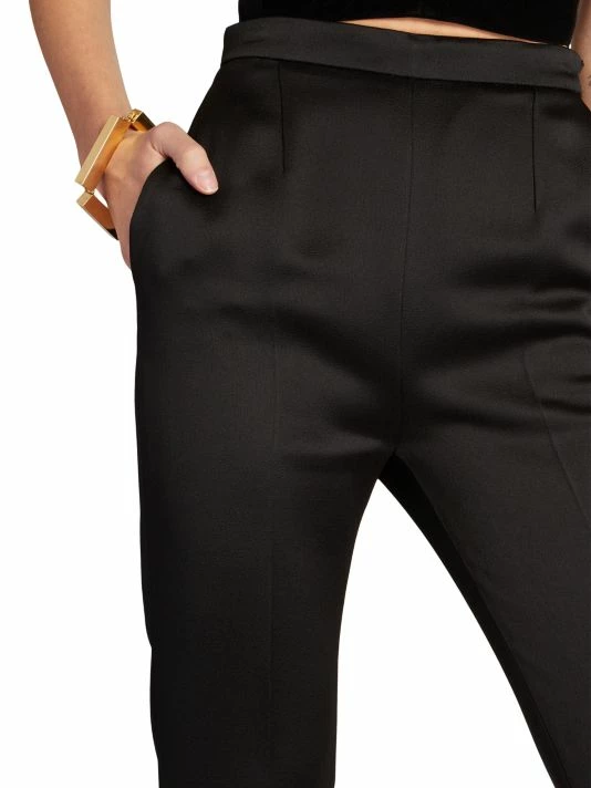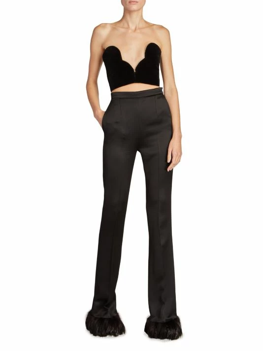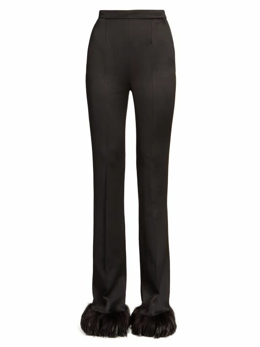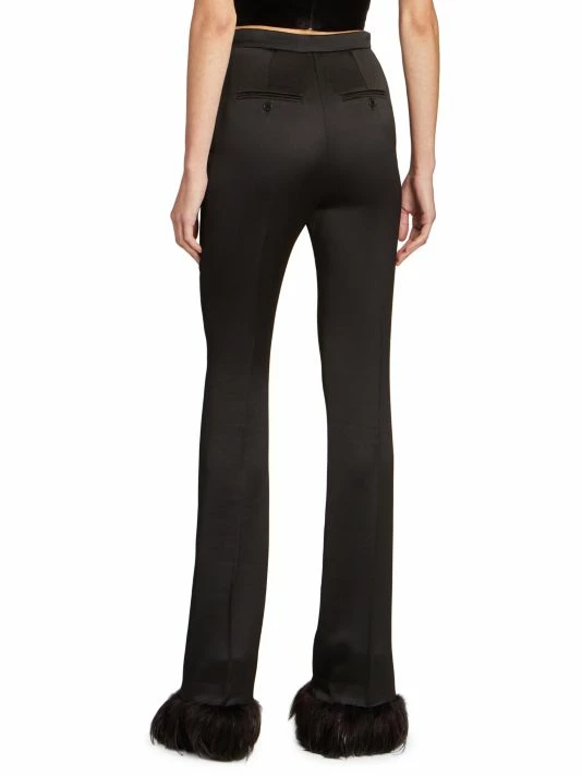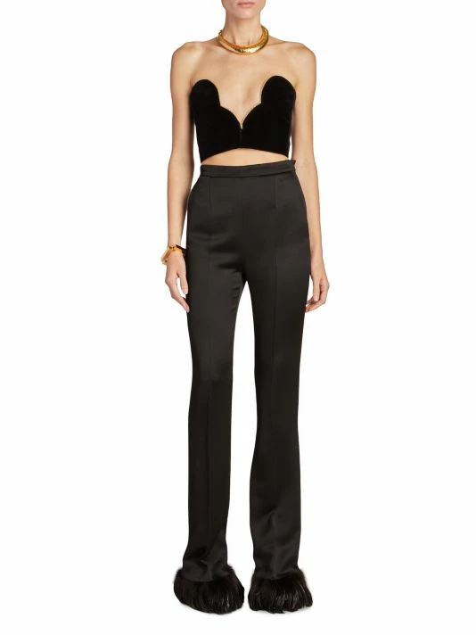 Crafted of a satin crepe, these slim-fit pants are adorned with feathered cuffs at the hem.