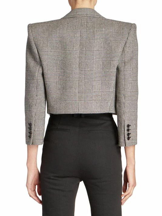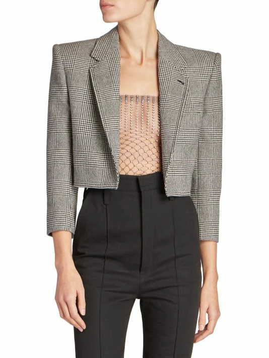 Crafted of luxurious Italian wool, this open cropped blazer has a classic glen check pattern updated with an edgy cropped length.