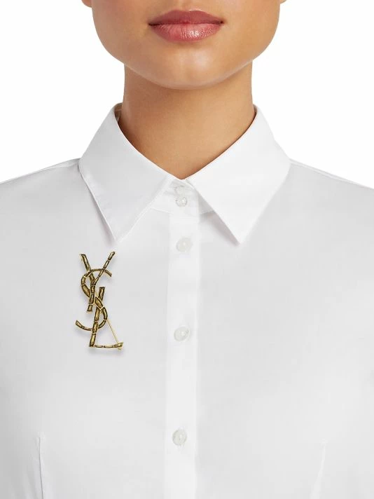 Saint Laurent’s goldtone brooch is designed in a textured, interlocking YSL lettering.