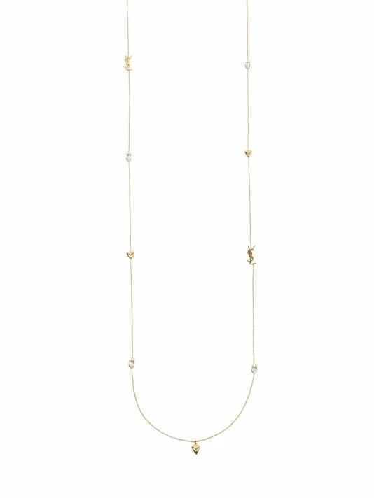 Saint Laurent’s long necklace is crafted of goldtone metal with heart, crystal, and logo charms.