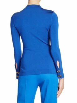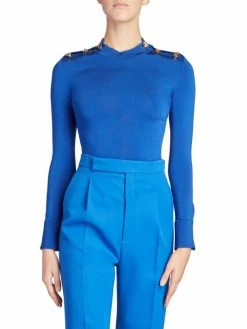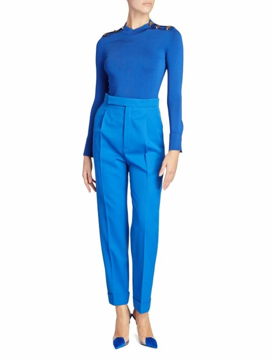 Saint Laurent’s fitted sweater is fashioned with a sophisticated mock turtleneck. Adorned with goldtone hardware at the shoulders, this top has a classic silhouette with an updated edge.