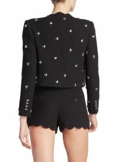 Slightly cropped, this wool-blend open jacket is adorned with silvertone heart appliquรฉs and scalloped trim.