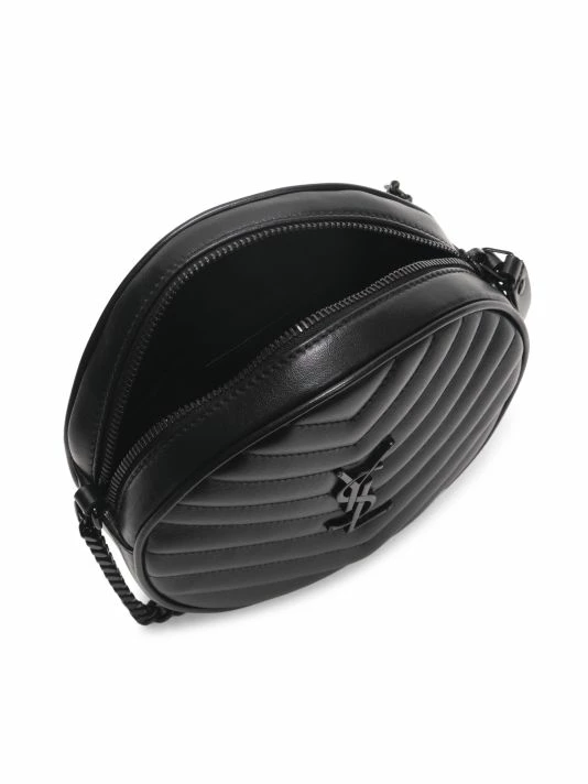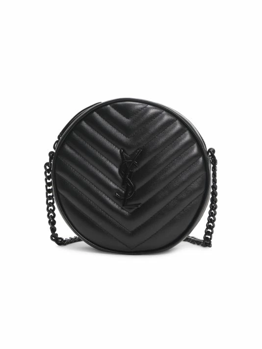 Dramatic matelassé bag styled in the round, with tonal monogram and curb chain strap.