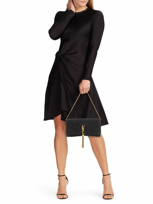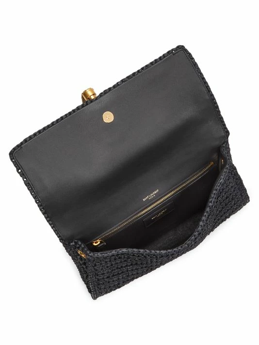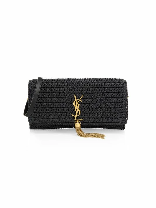 Decorated with the polished YSL-logo hardware and a chain tassel, Saint Laurent’s Kate 99 shoulder bag is made in Italy of woven raffia. This rectangular piece is accompanied by a removable chain strap and a adjustable leather strap.