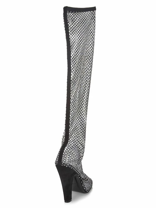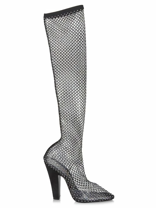 Boasting a fishnet mesh construction, Saint Laurent’s Koller boots are decorated with shimmering rhinestones. This Italian-made pair is anchored by an angled block heel.