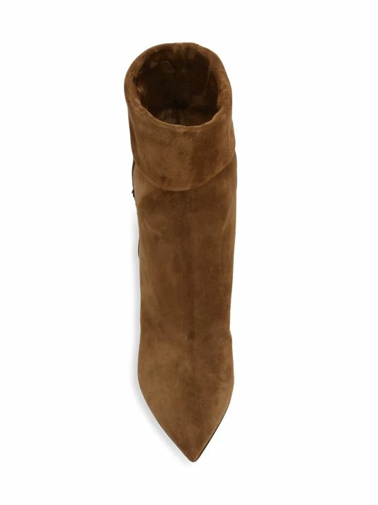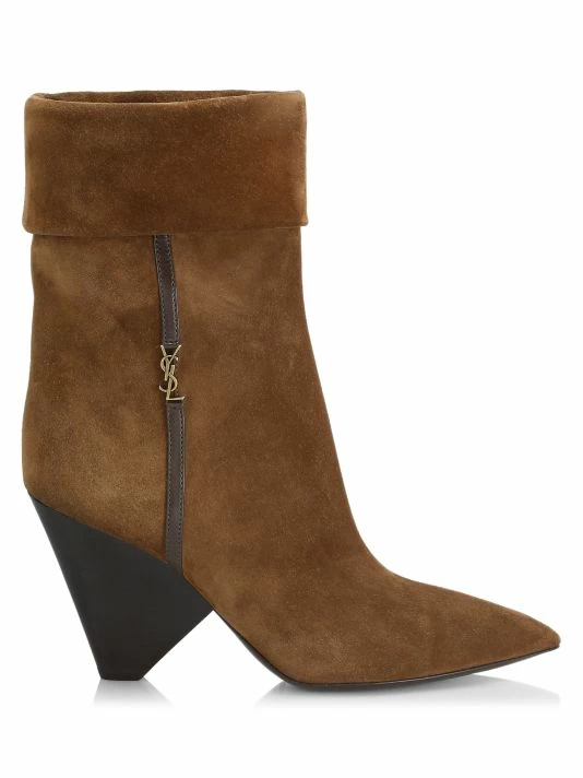 Versatile mid-calf boots embellished with ornate leather straps and a YSL emblem.