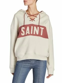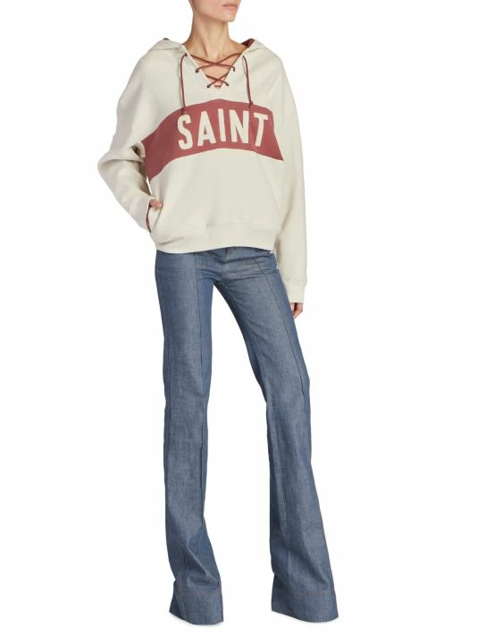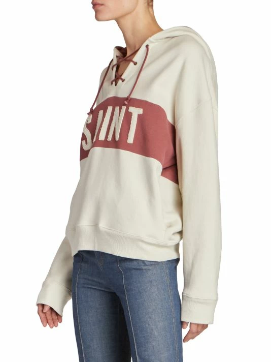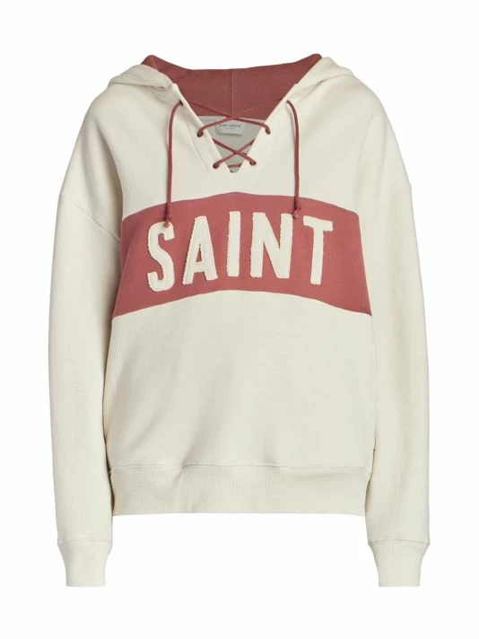 This oversized cotton hoodie has a boxy silhouetted, adorned with a contrasting varsity-style log at the chest and lace-up detail.
