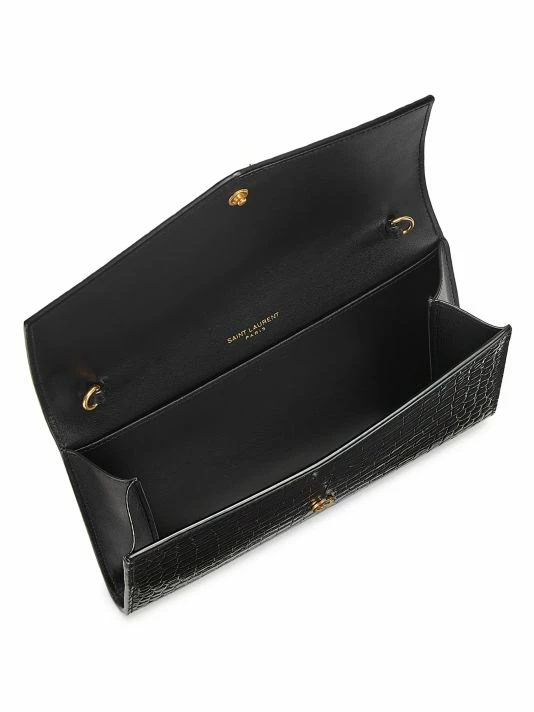 Highlighted with polished YSL logo hardware at the V-flap, Saint Laurent’s pouch is crafted of glossed crocodile-embossed leather. This Italian-made piece is accompanied by a sleek chain strap.