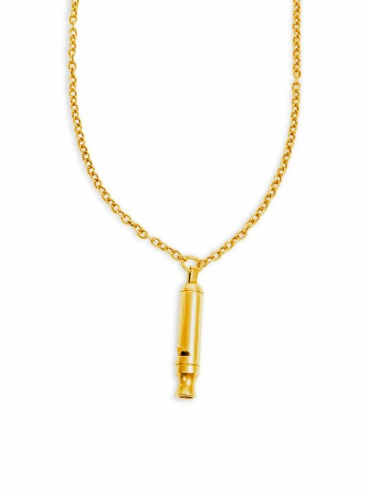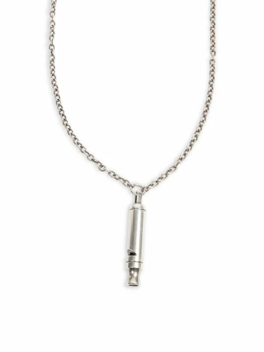 Made in Italy, Saint Laurent’s necklace features a long chain with a logo-engraved whistle charm.