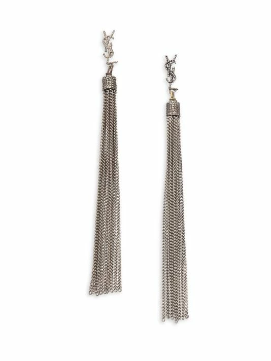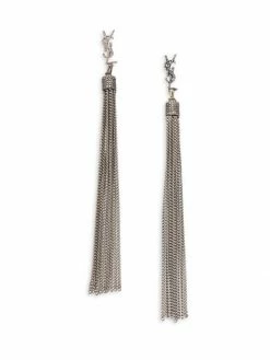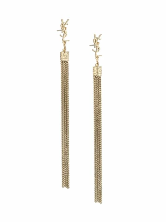 Long chain tassels gracefully fall from the YSL logo charm on these elegant earrings.