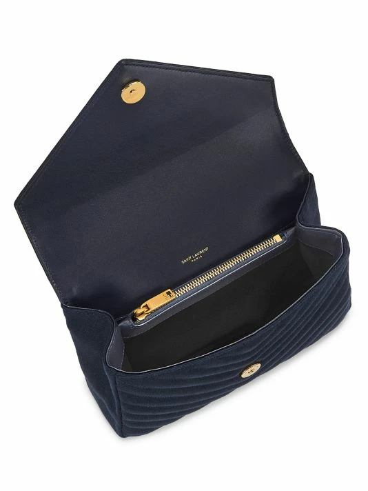 Highlighted with polished YSL logo hardware at the V-flap, Saint Laurent’s College bag is crafted of chevron-quilted canvas. This luxurious piece is accompanied by a chain strap and top handle for versatile placement.