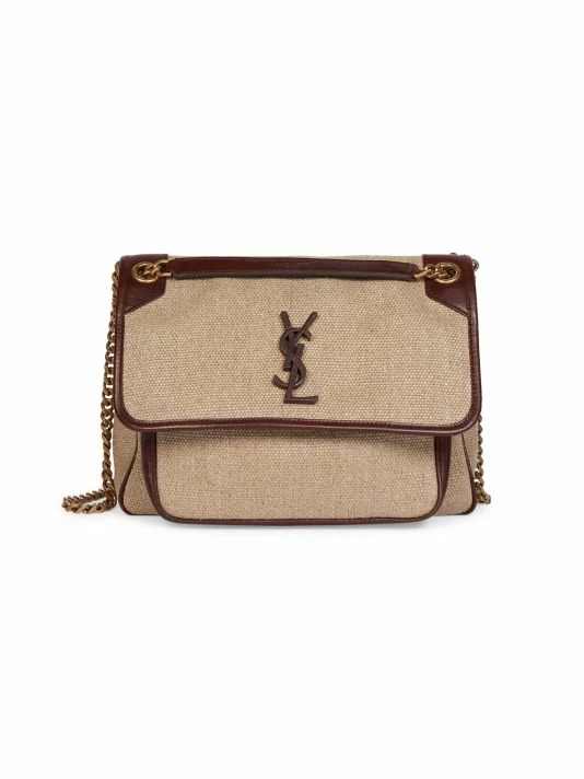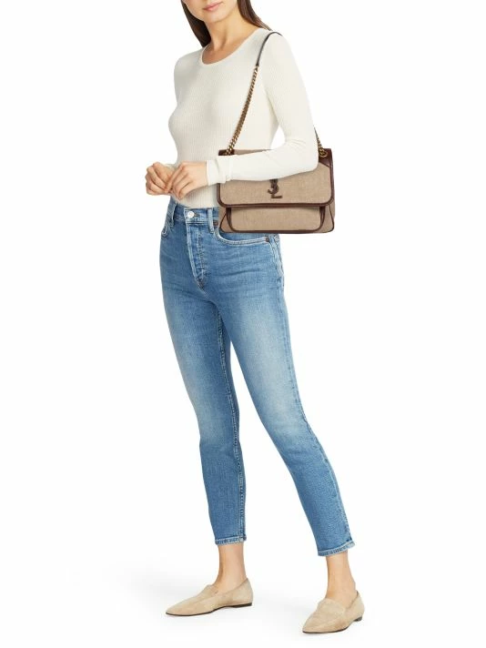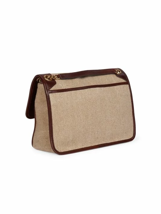 Classic styling and signature monogram hardware adds an elegant touch to this slouchy linen shoulder bag.