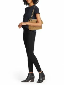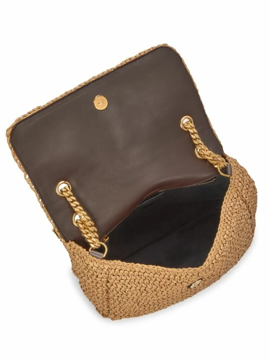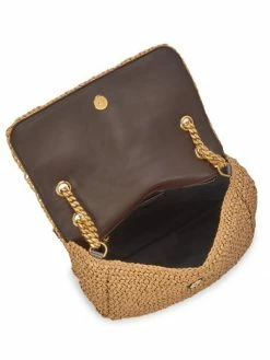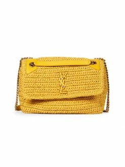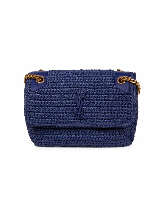 Made in Italy, Saint Laurent’s Niki bag is crafted of woven raffia and rich leather. This luxurious piece is highlighted with YSL logo hardware and a sliding chain strap.