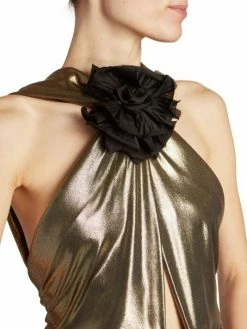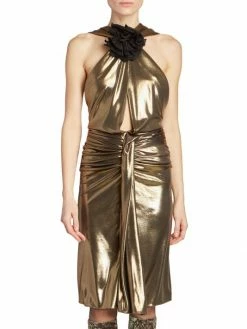 This elegant sheath dress from Saint Laurent is finished in an eye-catching metallic, tied at the halter neck with a contrasting rosette. Centered with a large keyhole at the bodice, this style is draped at the waist adding to the dynamic silhouette.
