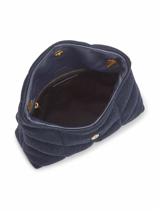 Highlighted with YSL logo hardware, Saint Laurent’s shoulder bag is crafted of chevron-quilted canvas with a padded finish. This Italian-made piece is accompanied by a sleek convertible chain strap.