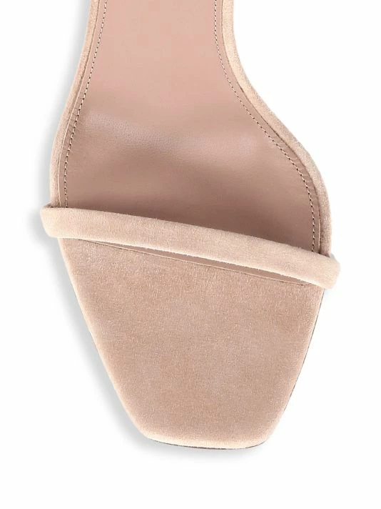 A soft suede finish contrasts the polished goldtone YSL-shaped heel of these dainty two-strap sandals.