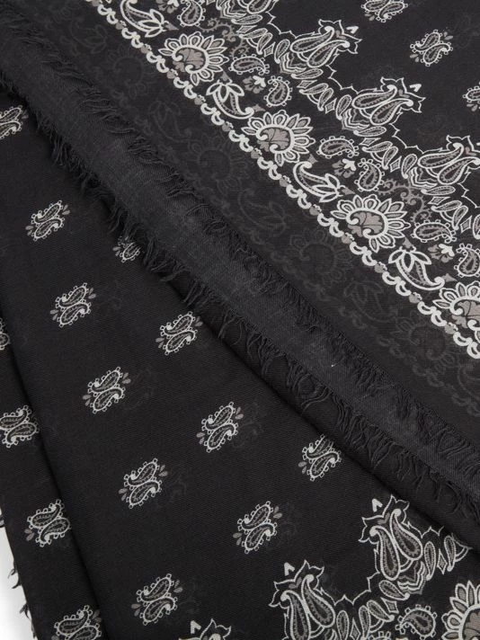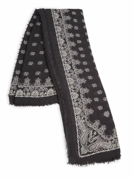 Italian-made bandana scarf showcasing a classic paisley print finished with wispy edges.