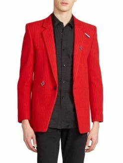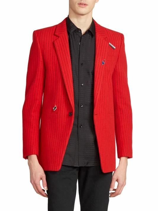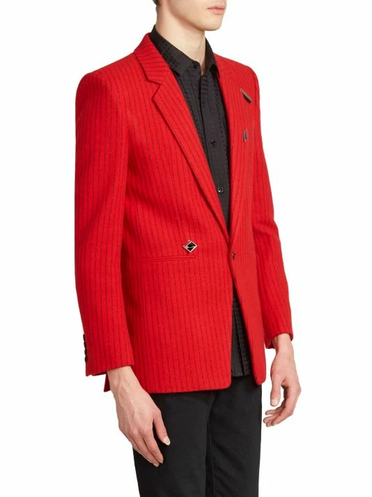 Tailored to a slightly shrunken silhouette, this vibrant pinstriped stretch wool blazer is embellished with decorative enamel pins.