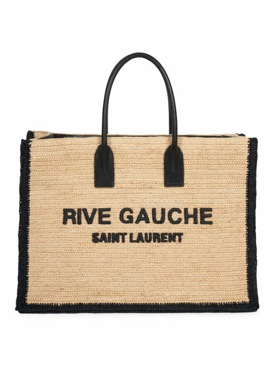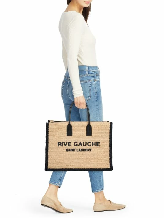 Saint Laurent’s Rive Gauche tote is skillfully crafted in Italy of woven raffia with a spacious interior. Adorned with leather tubular straps, this easily recognizable piece is defined with bold logo text at the front.