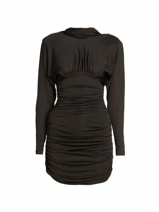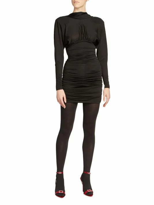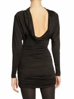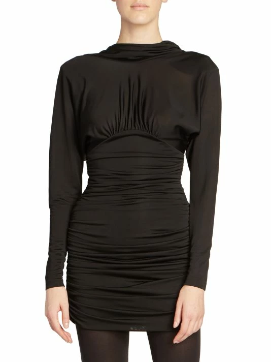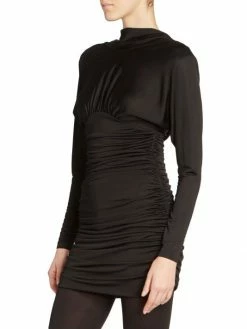 This sleek silk minidress from Saint Laurent showcases a flattering ruched bodice, topped with a blouson bodice and draped back creating an elegant silhouette.