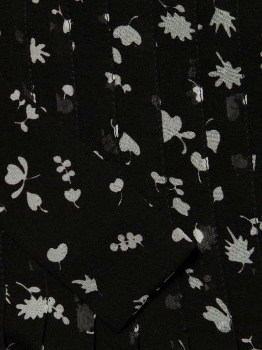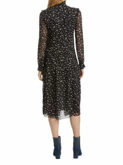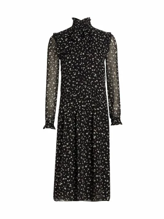 Lightweight floral dress with semi-sheer sleeves and a self-tie ruffle neckline.