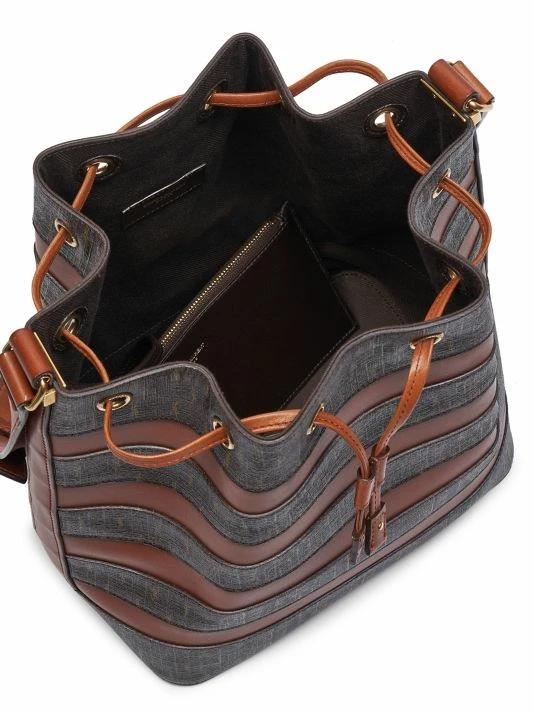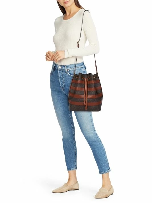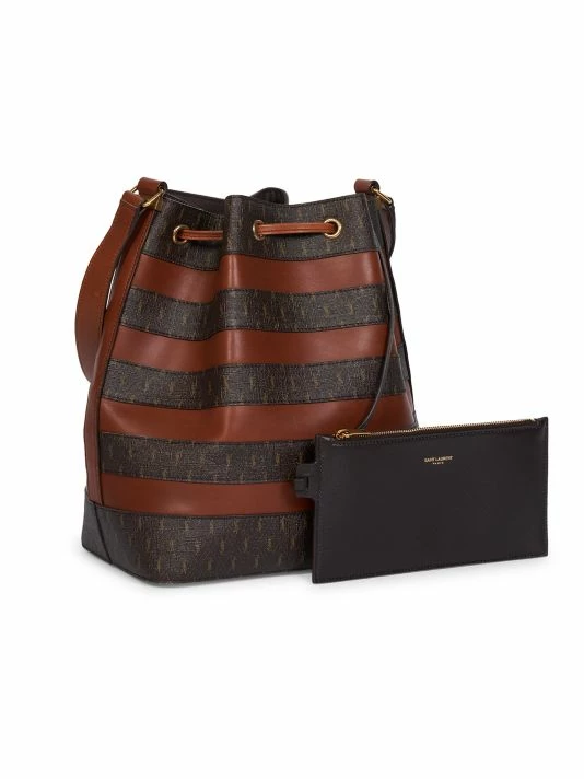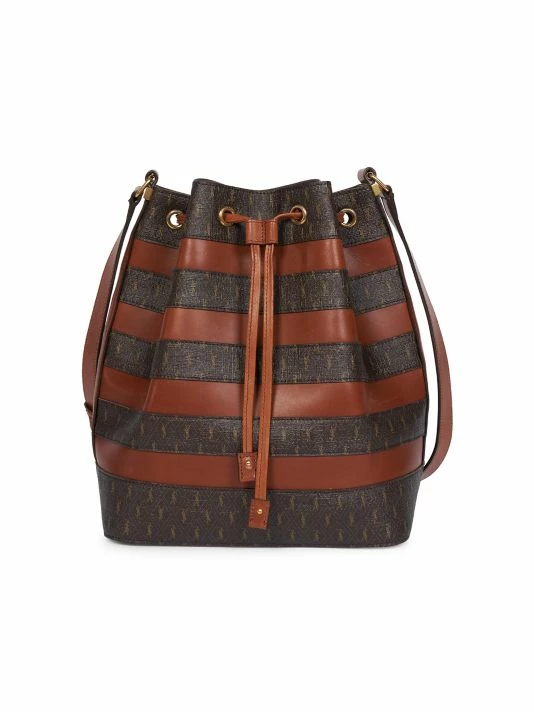 Signature monogram and smooth leather panels creates this bucket featuring an adjustable shoulder strap.