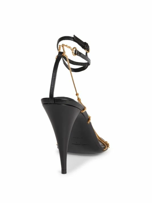 Alluring golden chain straps elevate these lambskin stilettos, featuring a strappy ankle detail.