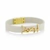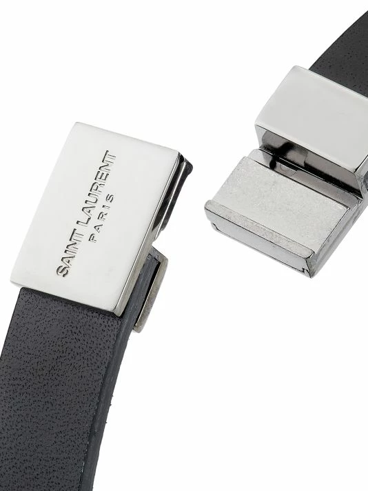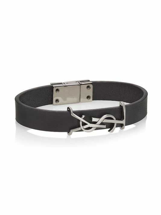 Saint Laurent’s leather bracelet is adorned with a silvertone logo motif.