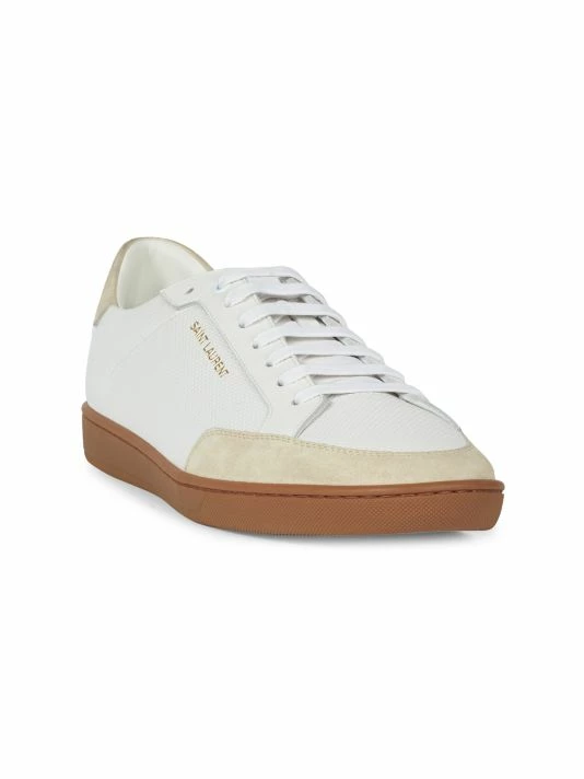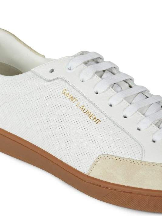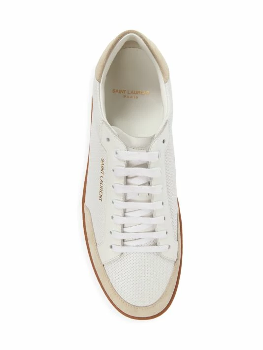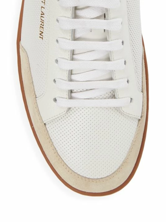 Saint Laurent introduced its famous Le Smoking tuxedo in 1966, a rendition of the classic men’s smoking suit made for women. Inspired by the iconic silhouette and 1970s women’s archival pieces, Creative Director Anthony Vaccarello reinterprets these styles for menswear with slinky, billowing shapes, delicate textures, and intricate patterns. The result is a unique, androgynous look that celebrates fluidity as a cornerstone of contemporary fashion. A combination of suede and perforated leather defines these low-top sneakers. The style is finished with a metallic foil logo printed at the quarter.