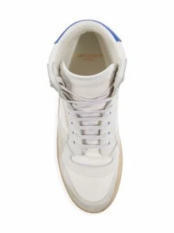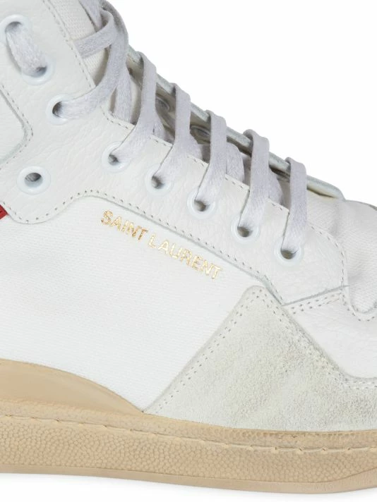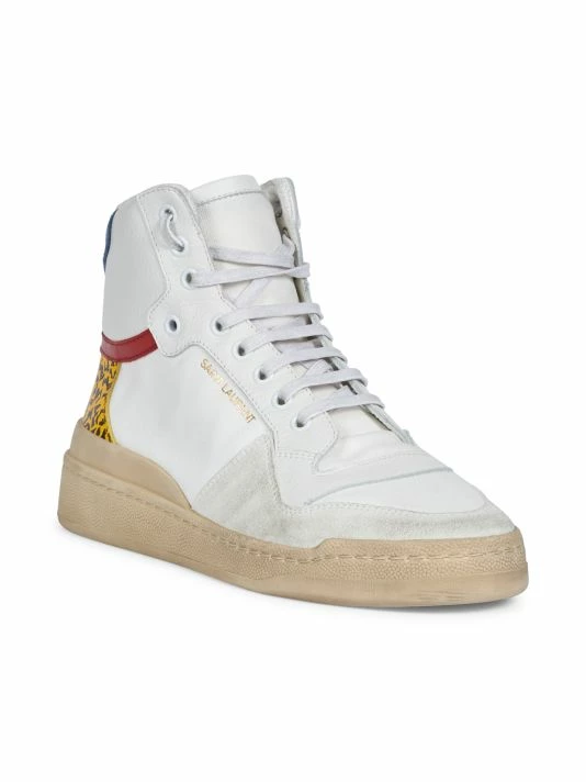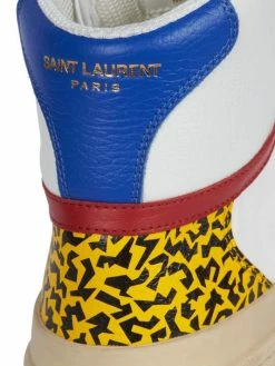 Canvas high-tops with a delicate foil-stamped logo at the heel and a graphic colorblocked design.