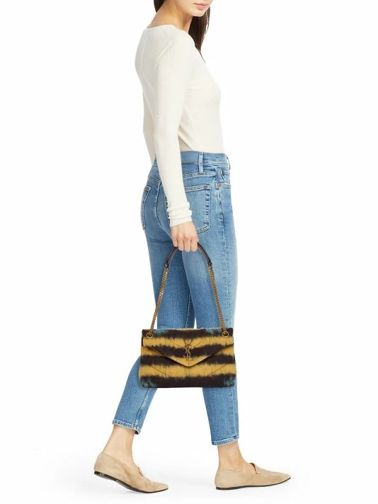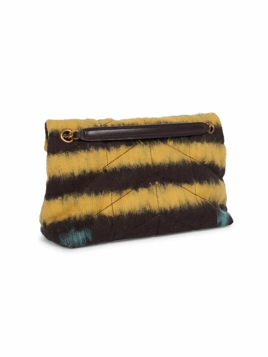 Graphic wool-knit stripe patterning bedecks this lambskin shoulder bag accented by contrast topstitching and a signature monogram at the front.