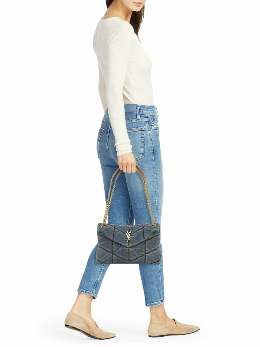 Made in Italy of quilted denim, Saint Laurent’s LouLou bag is highlighted with polished YSL logo hardware. This luxurious piece is accompanied by a sliding chain strap.