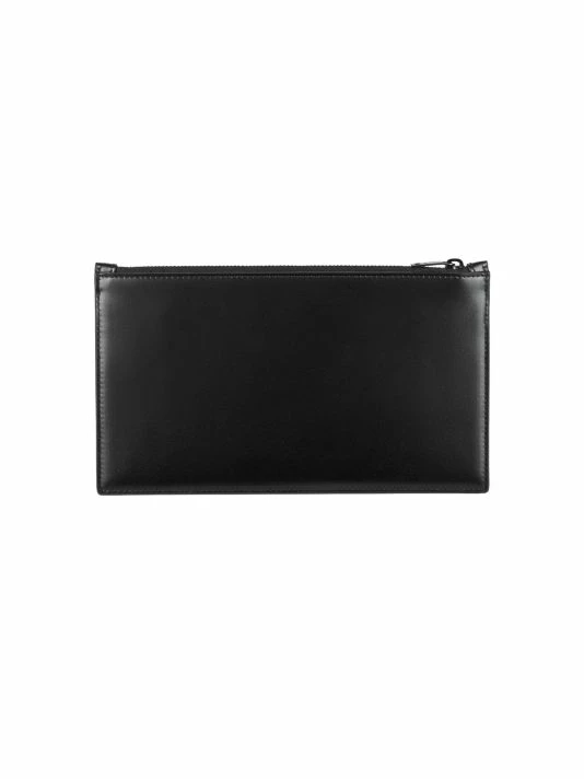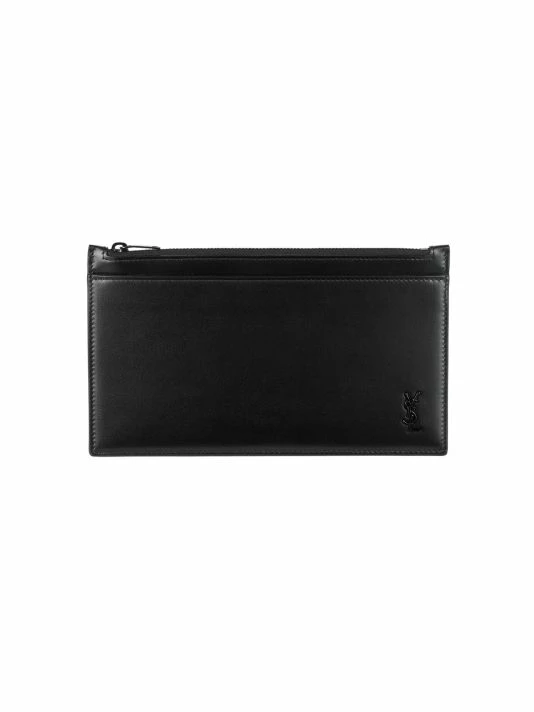 Smooth leather credit card wallet featuring blacked out brand logo and black top zipper closure.